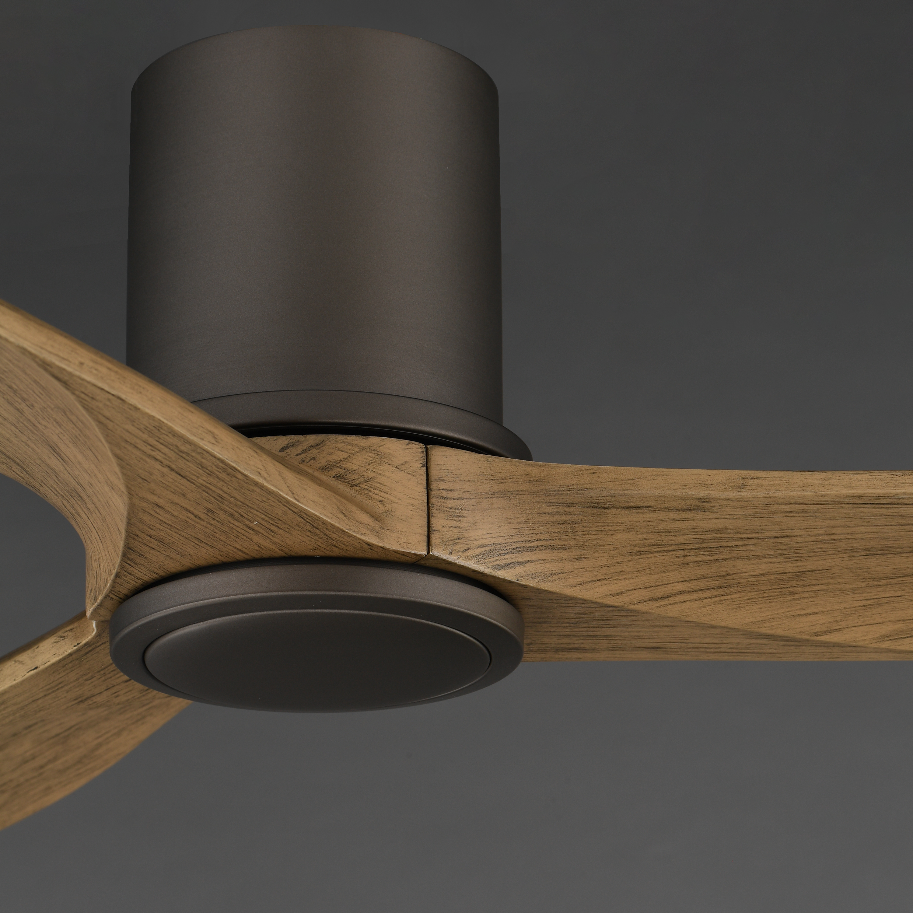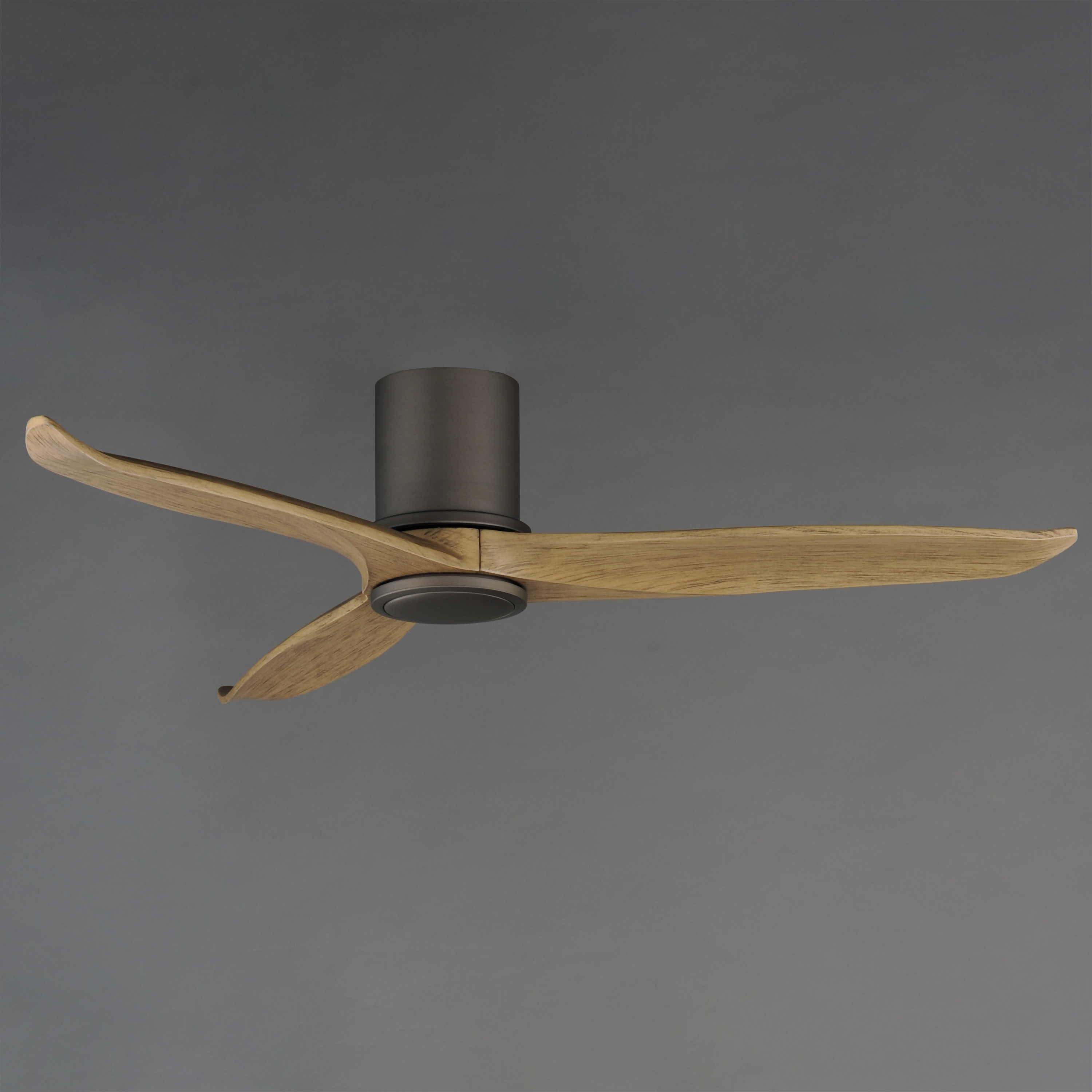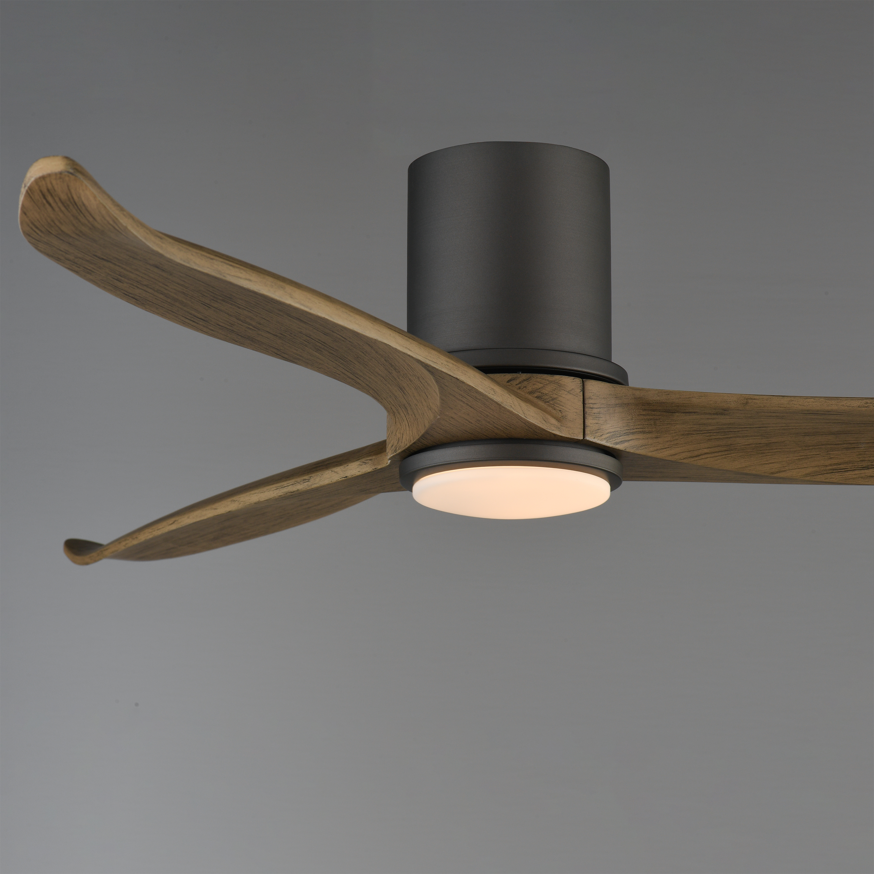 Solid Wood blades curve as they rotate around a center housing with LED light kit included. An additional cover plate is included if the light kit is not used. Select from stylish finish combinations including Natural Aged Brass with White Wood, Satin Nickel with Greywood, Black with Walnut wood, or Charcoal Bronze with Distressed Wood.