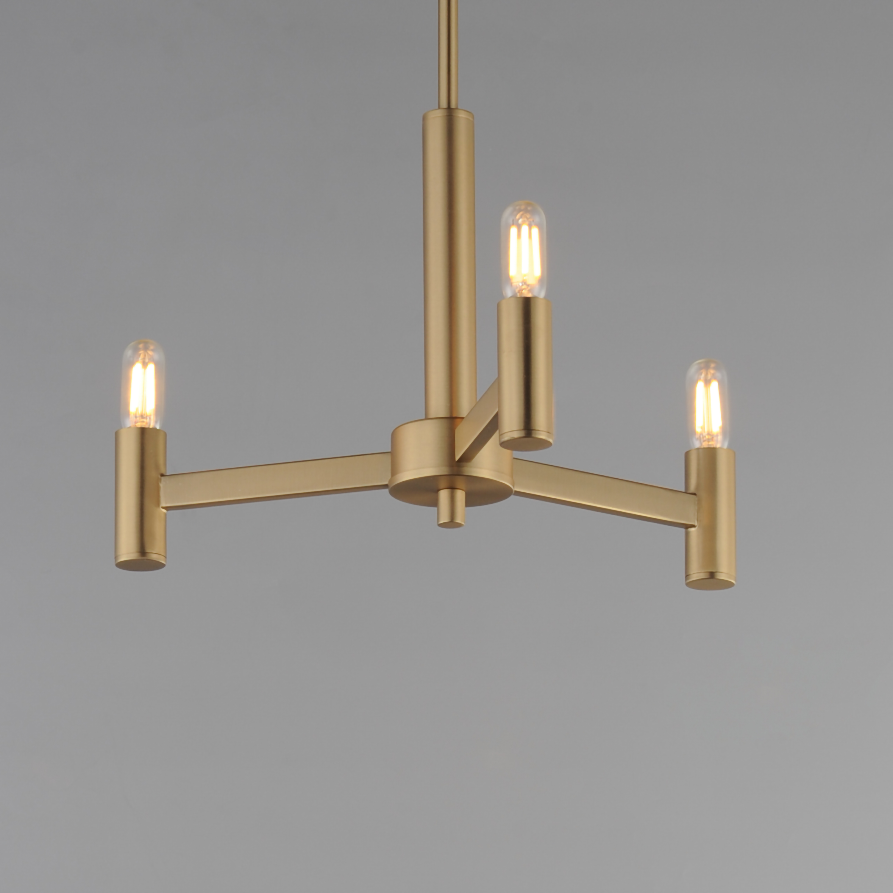Straight extensions of rectilinear arms emanate from a cylindrical center housing in this transitional design. The candelabra is made in a corresponding cylindrical form playing into the geometries of this streamlined chandelier design. Available in a textured sandy Black or Natural Aged Brass, this collection pairs well with many design aesthetics at an economical price point. Use tubular lamps for an industrial or more modern aesthetic or torpedo shape for an update to the conventional chandelier design.