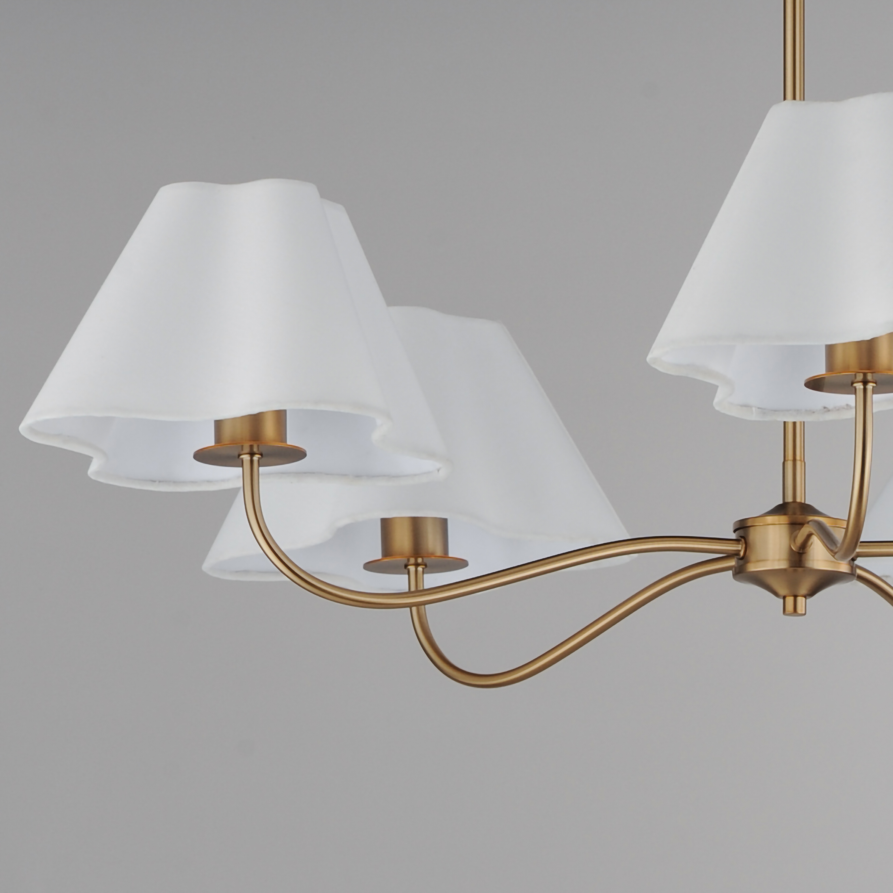 Inspired by classic European candelabra chandeliers, this collection pairs a timeless sweeping frame with shades that set it apart. Swooping arms support soft white linen shades formed in a distinctive undulating wave, adding movement and subtle drama to a familiar silhouette. The contrast between structured metalwork and fluid fabric captures the Kismet House aesthetic-traditional yet unexpectedly elegant, expressive, and quietly memorable.