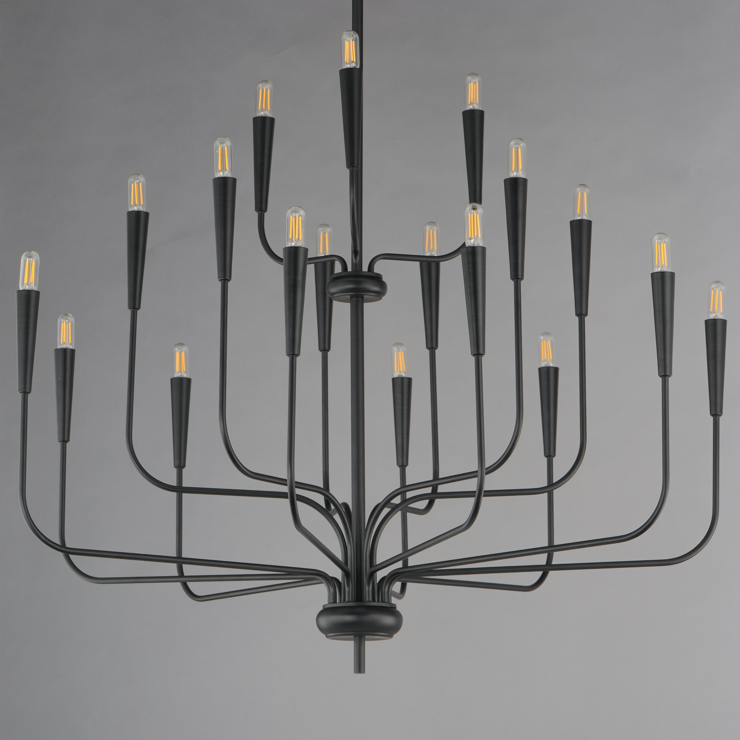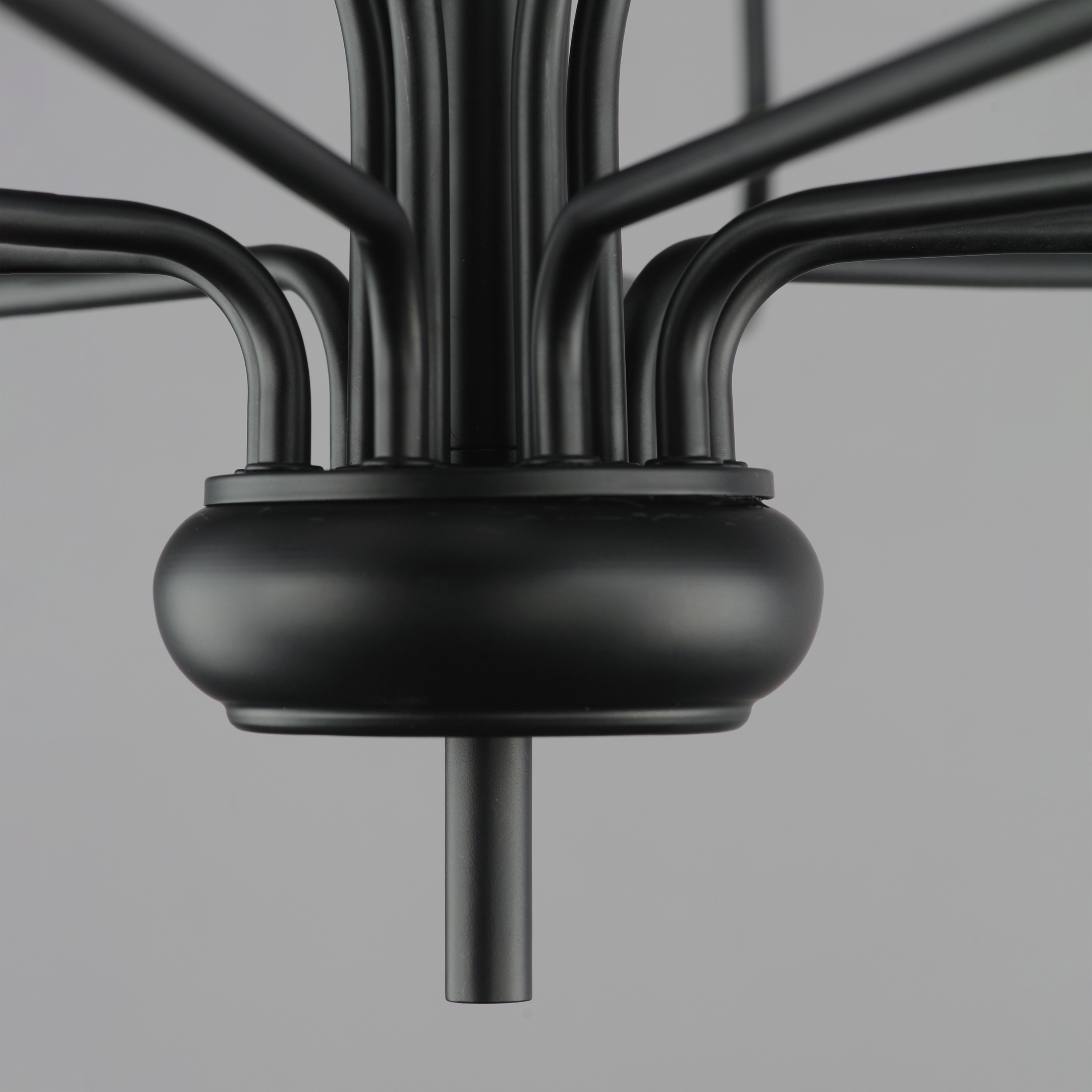 A simple candle style chandelier is given a modern edge with tall tapered candle covers that sit at the ends of curved arms without a bobeche beneath them. Available in Satin Brass or Matte Black, the collection compliments many architectural interiors and allows for creative styling through the selection of lamp type. Pair with our T6 lamp for more modern, industrial flair or classic candelabra for a clean, transitional look. This series provides a convenient new take on the candle chandelier with subtle and unique design details.