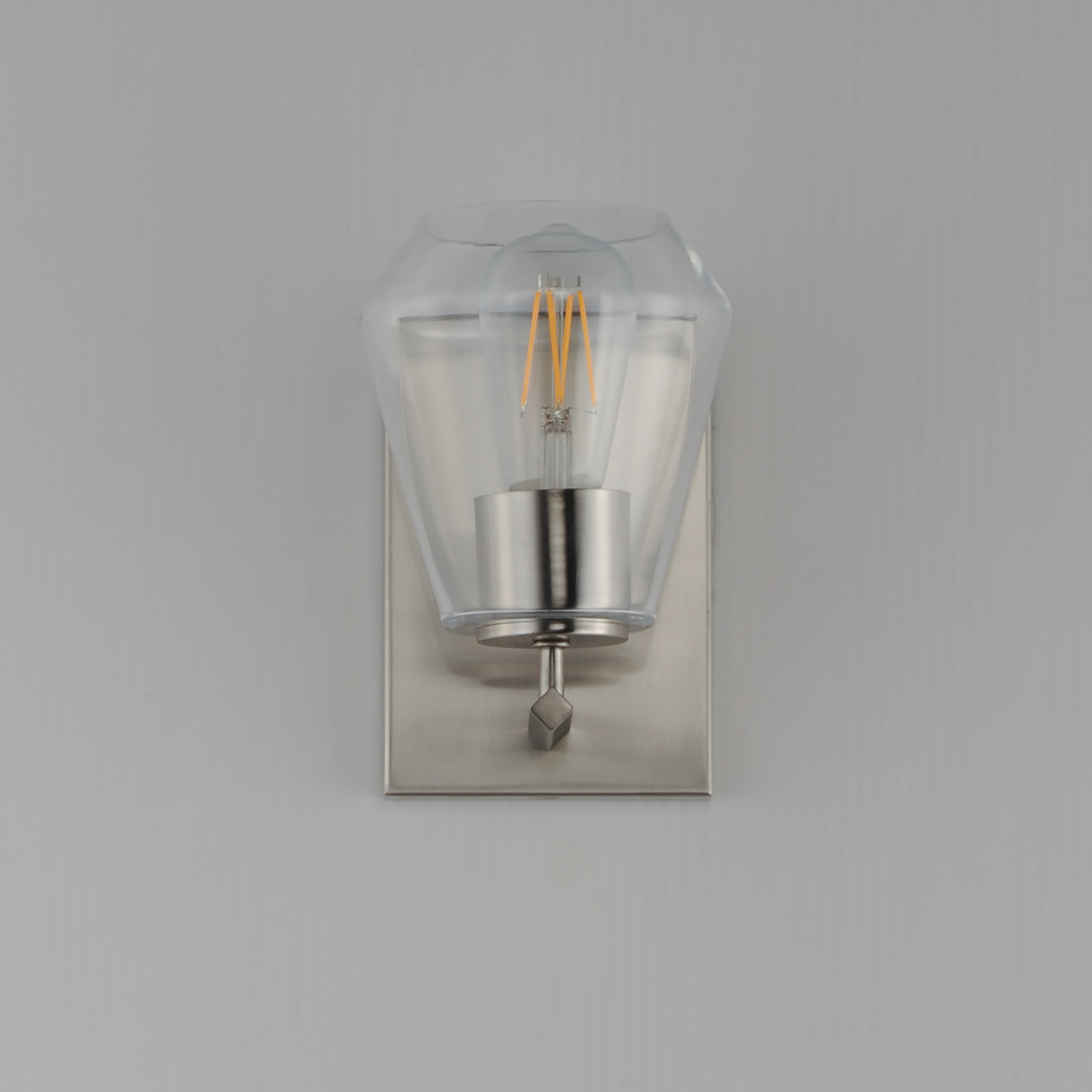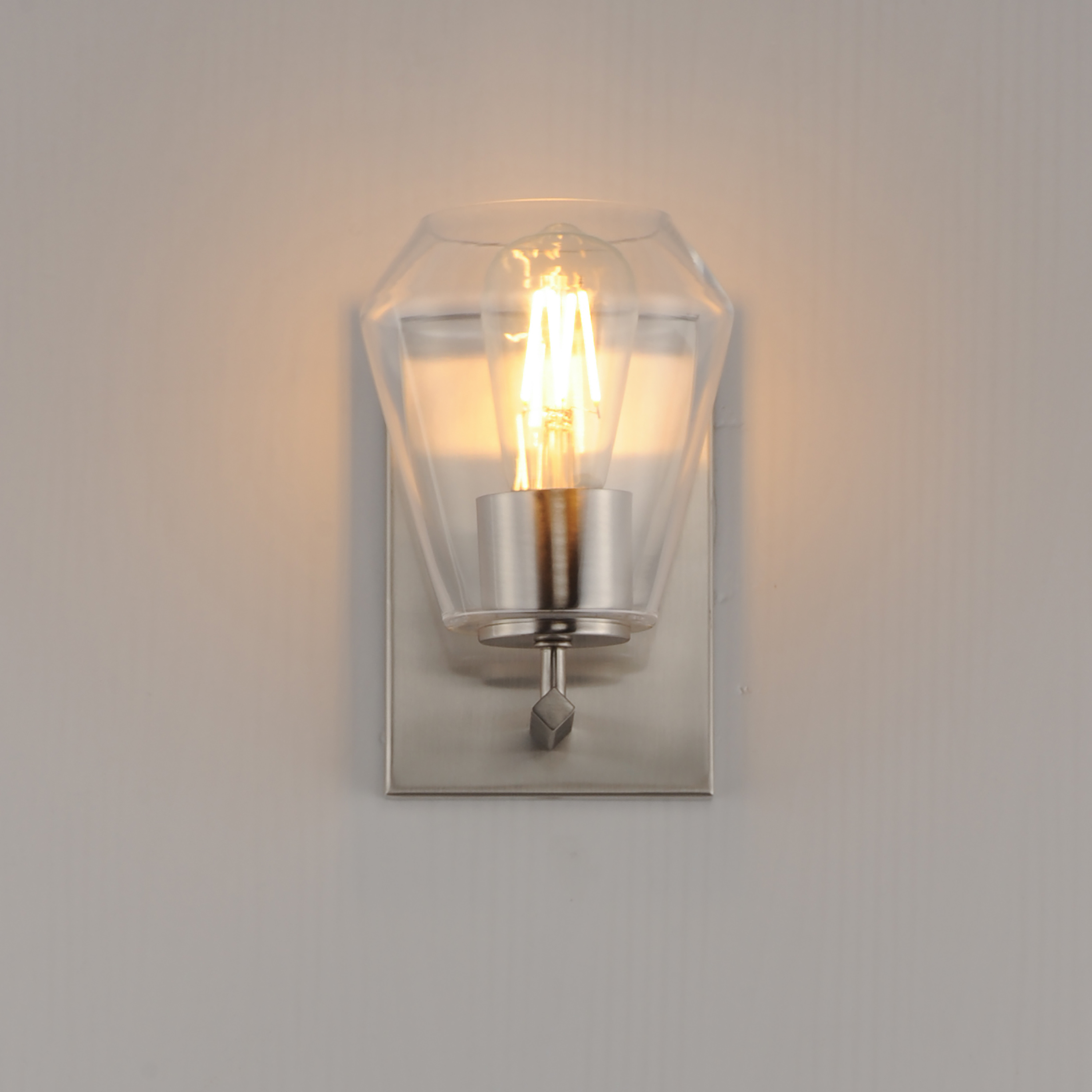 Crystalline clarity meets modern structure in the Geode collection. Inspired by the faceted symmetry of natural mineral formations, each clear glass shade is cut in an angular form that plays with light and shadow. The bold, geometric silhouette feels effortlessly architectural -- elevated further by subtle industrial notes like knurled screw collars and diamond shaped tubing on bath configurations. Offered in a range of sizes and finishes, Geode brings sculptural interest to kitchens, bathrooms, and dining rooms as well as statement-making entryways.