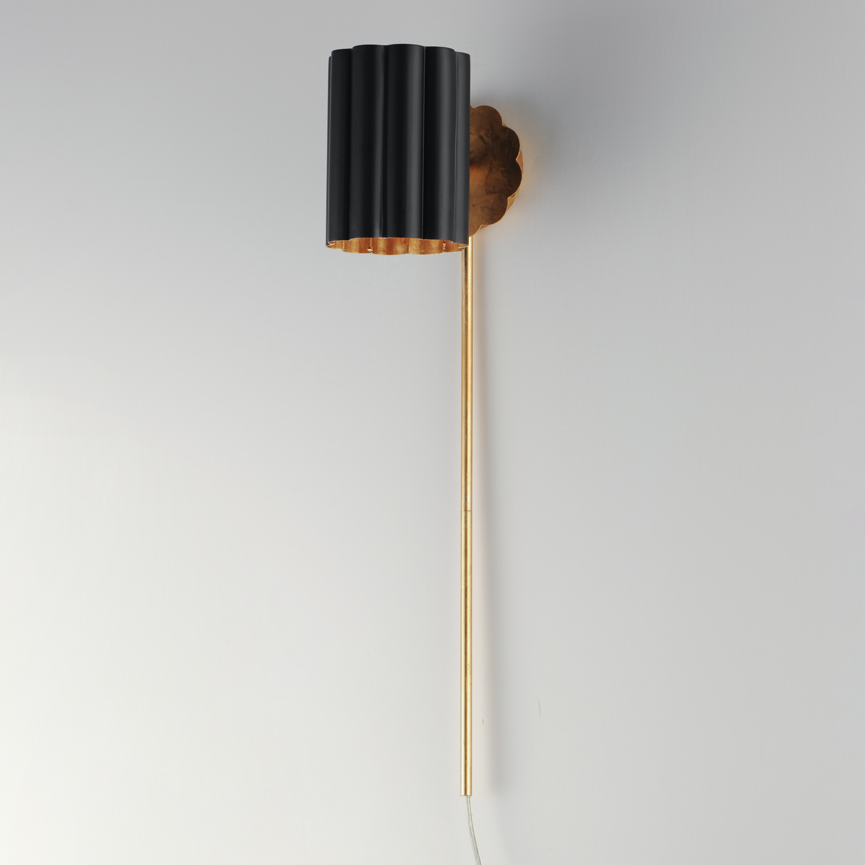 This refreshing collection features the nostalgic detailing of scalloped metal shades with gold leaf interiors. The hand applied gold-leaf interiors reflect the light source within the shades casting a warmer glow downwards. The collection is offered in charming chain hung pendants, a flush mount with Opal White schoolhouse glass, or oversized sconces. Available in Matte Black, Matte White, or Dark Grey with Gold leaf interiors and metalwork.