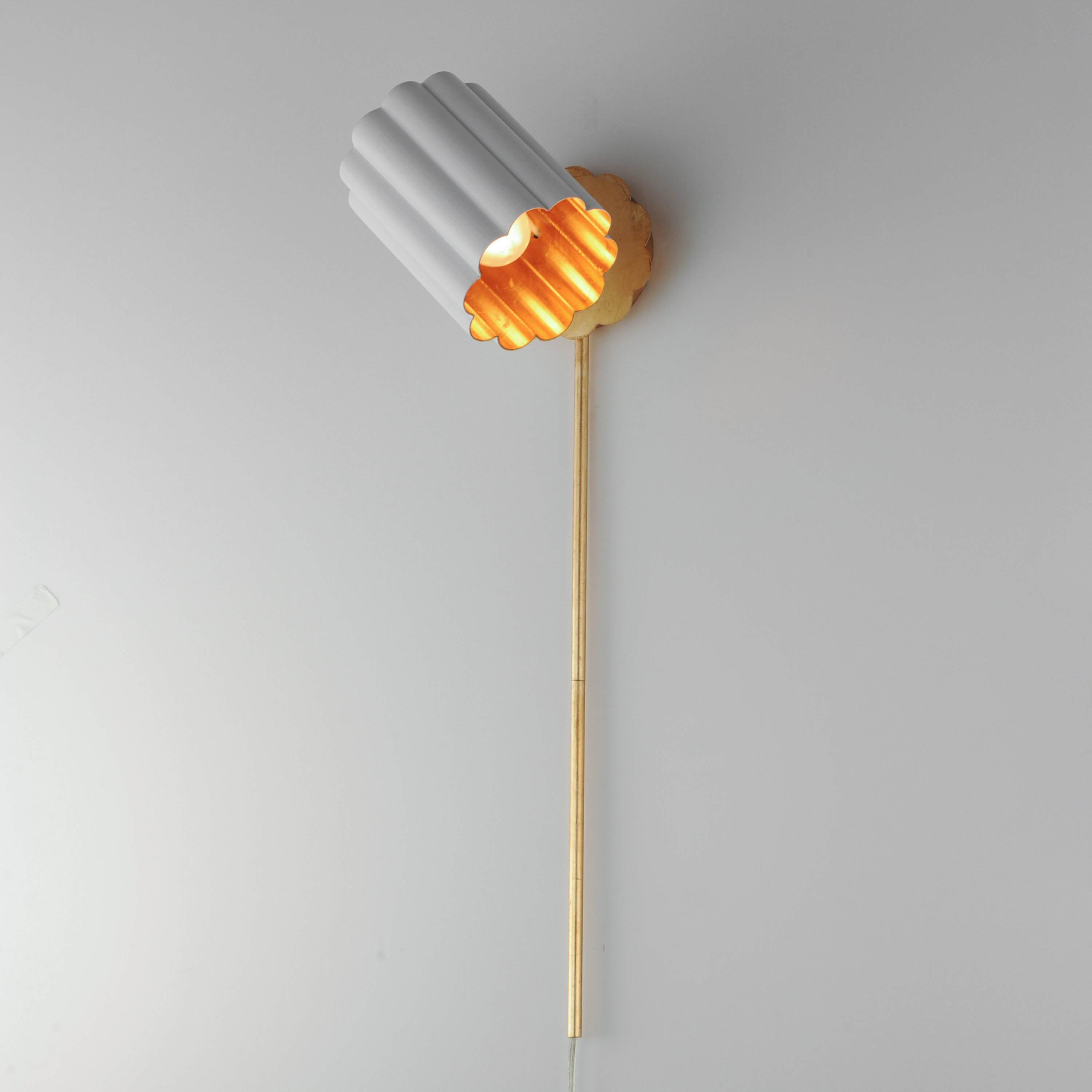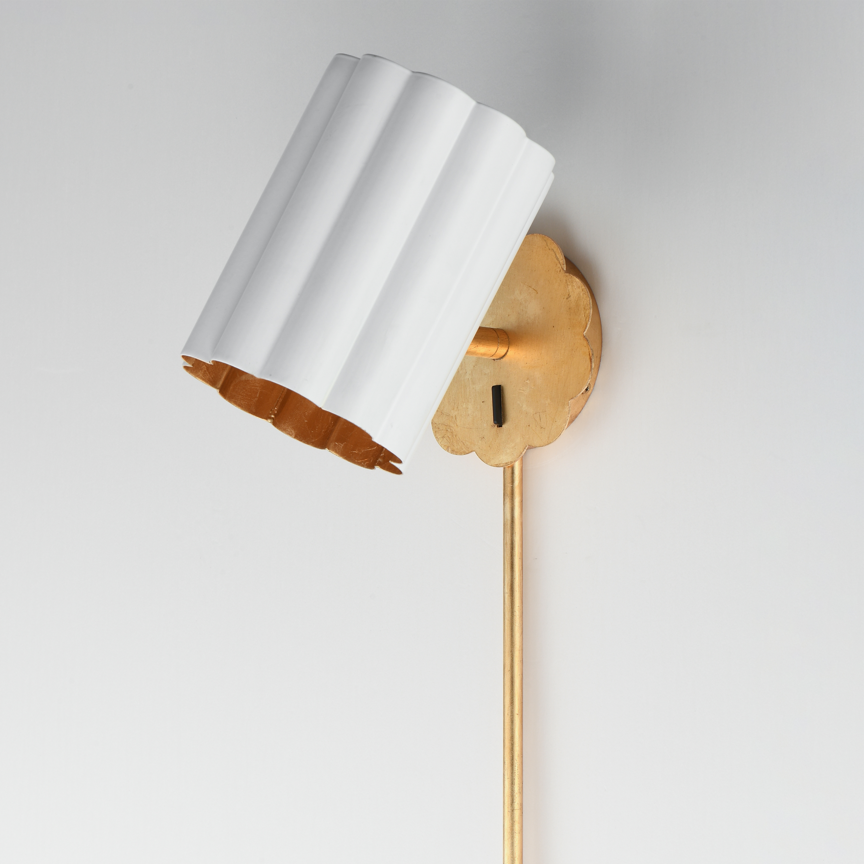 This refreshing collection features the nostalgic detailing of scalloped metal shades with gold leaf interiors. The hand applied gold-leaf interiors reflect the light source within the shades casting a warmer glow downwards. The collection is offered in charming chain hung pendants, a flush mount with Opal White schoolhouse glass, or oversized sconces. Available in Matte Black, Matte White, or Dark Grey with Gold leaf interiors and metalwork.