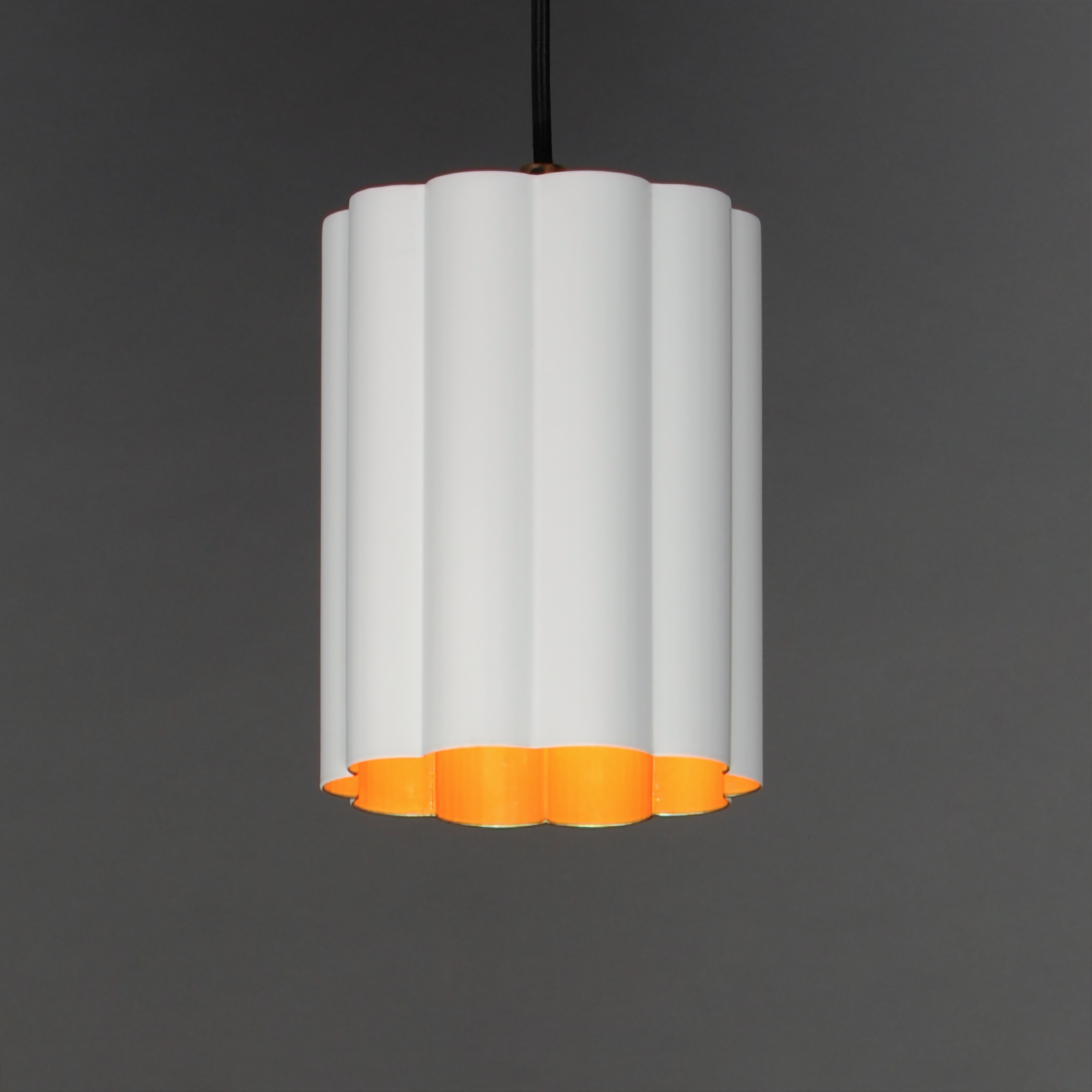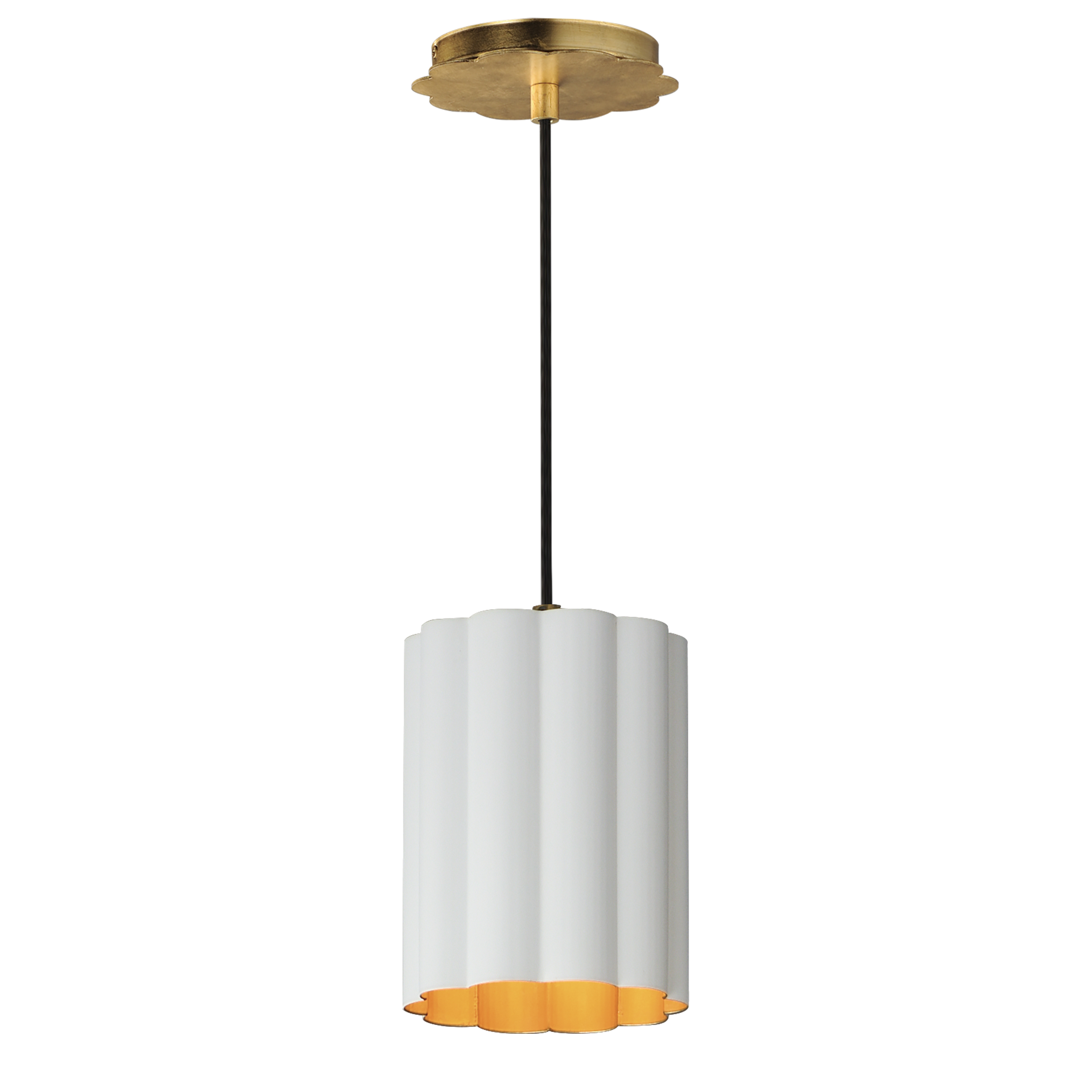 This refreshing collection features the nostalgic detailing of scalloped metal shades with gold leaf interiors. The hand applied gold-leaf interiors reflect the light source within the shades casting a warmer glow downwards. The collection is offered in charming chain hung pendants, a flush mount with Opal White schoolhouse glass, or oversized sconces. Available in Matte Black, Matte White, or Dark Grey with Gold leaf interiors and metalwork.
