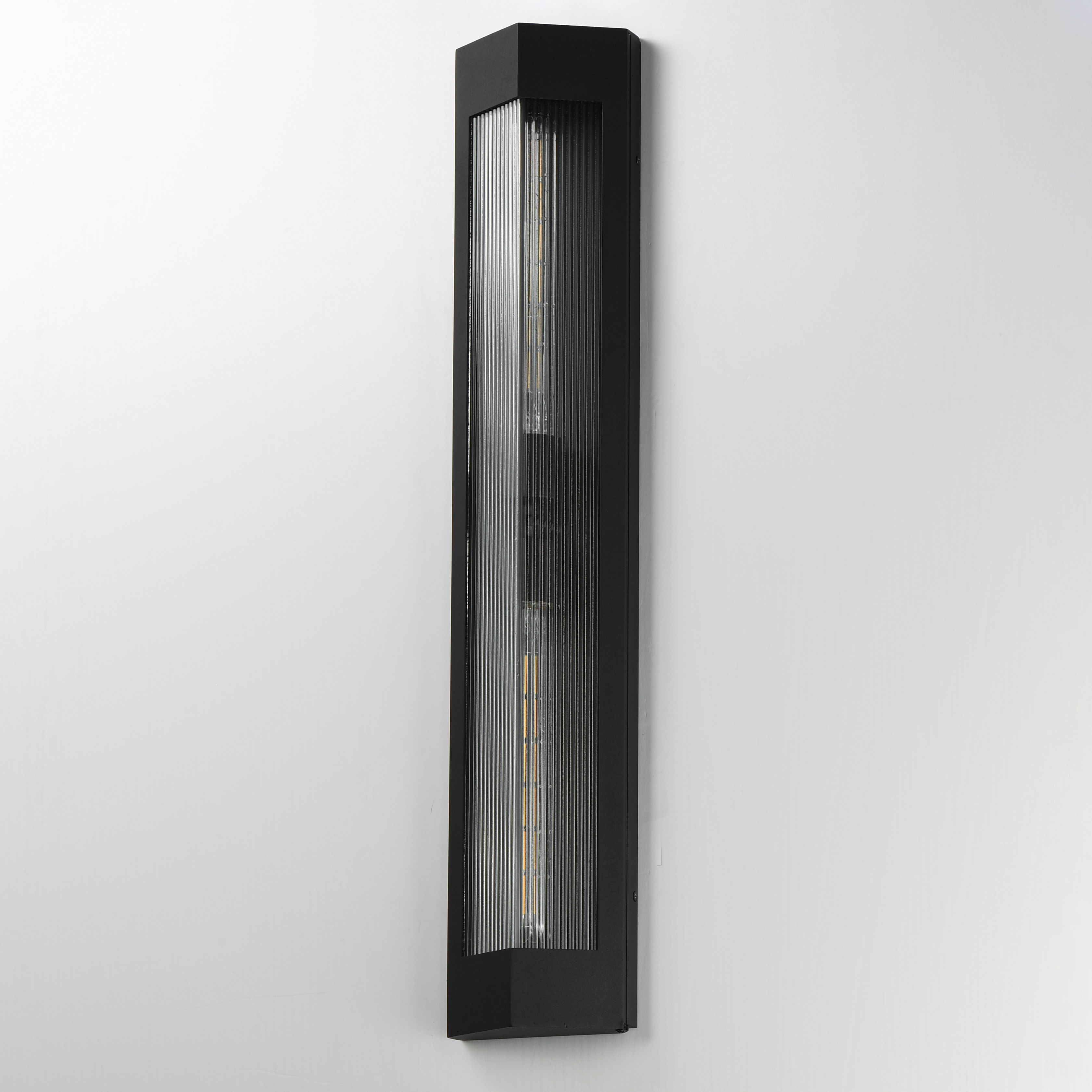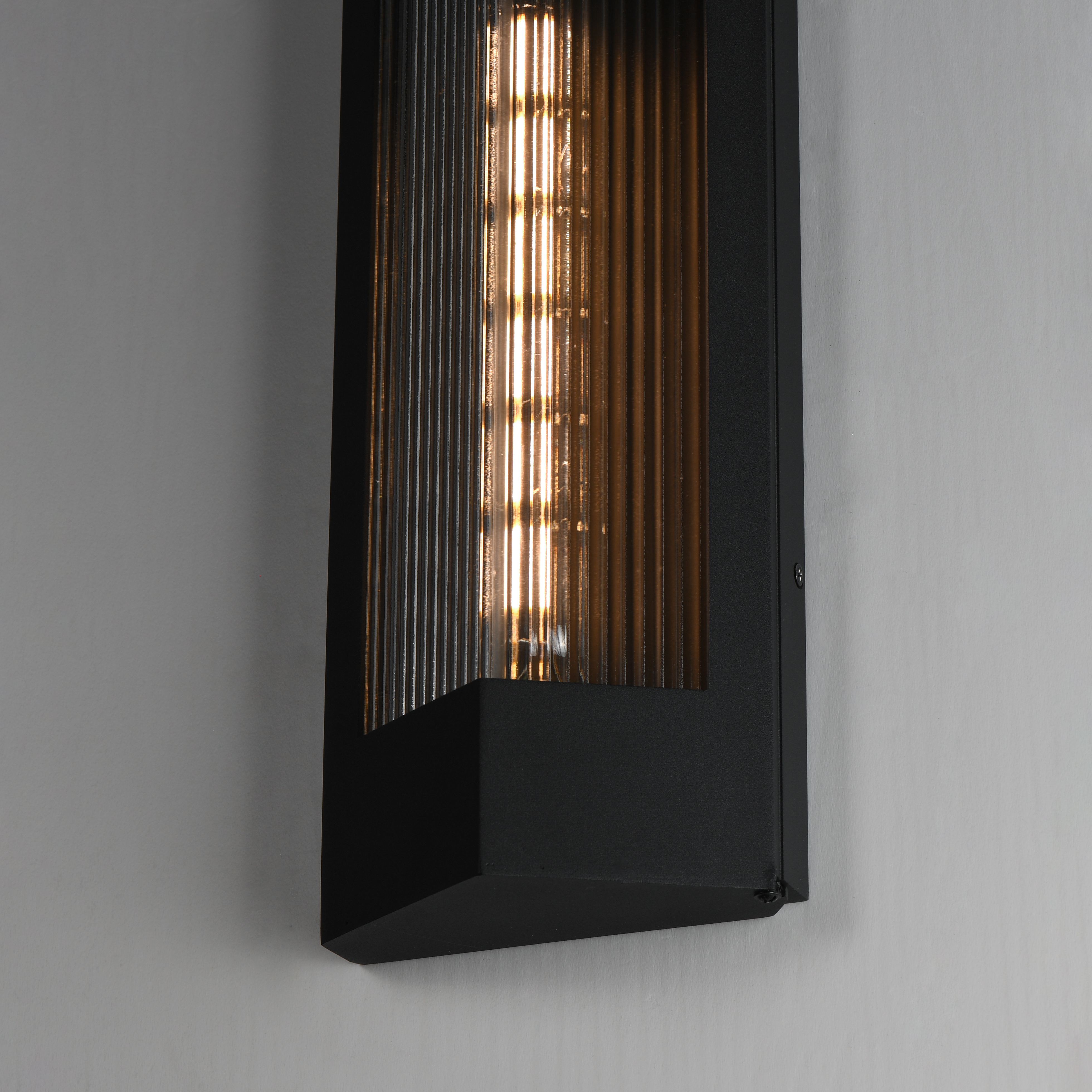 A transitional design suitable for both modern and more traditional applications, this outdoor series of lighting features Clear Ribbed glass that refracts the light source within triangular frames. A Black frame with warm Antique Brass light clusters within, the collection includes 3 sizes of wall sconces and 2 sizes of outdoor rated pendants. With a depth of less than 4 inches, this ADA compliant sconce may also be used in commercial applications.